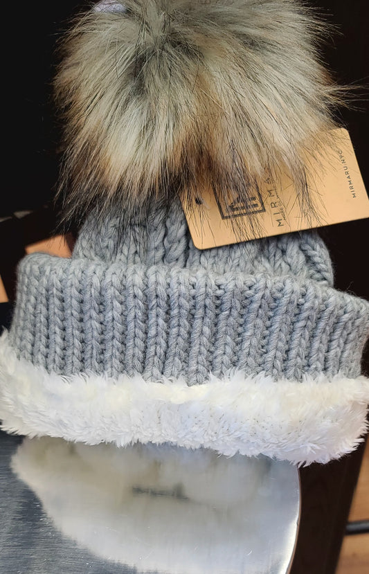 Faux Fur Pom Beanie Hat w/ Fleece Lining