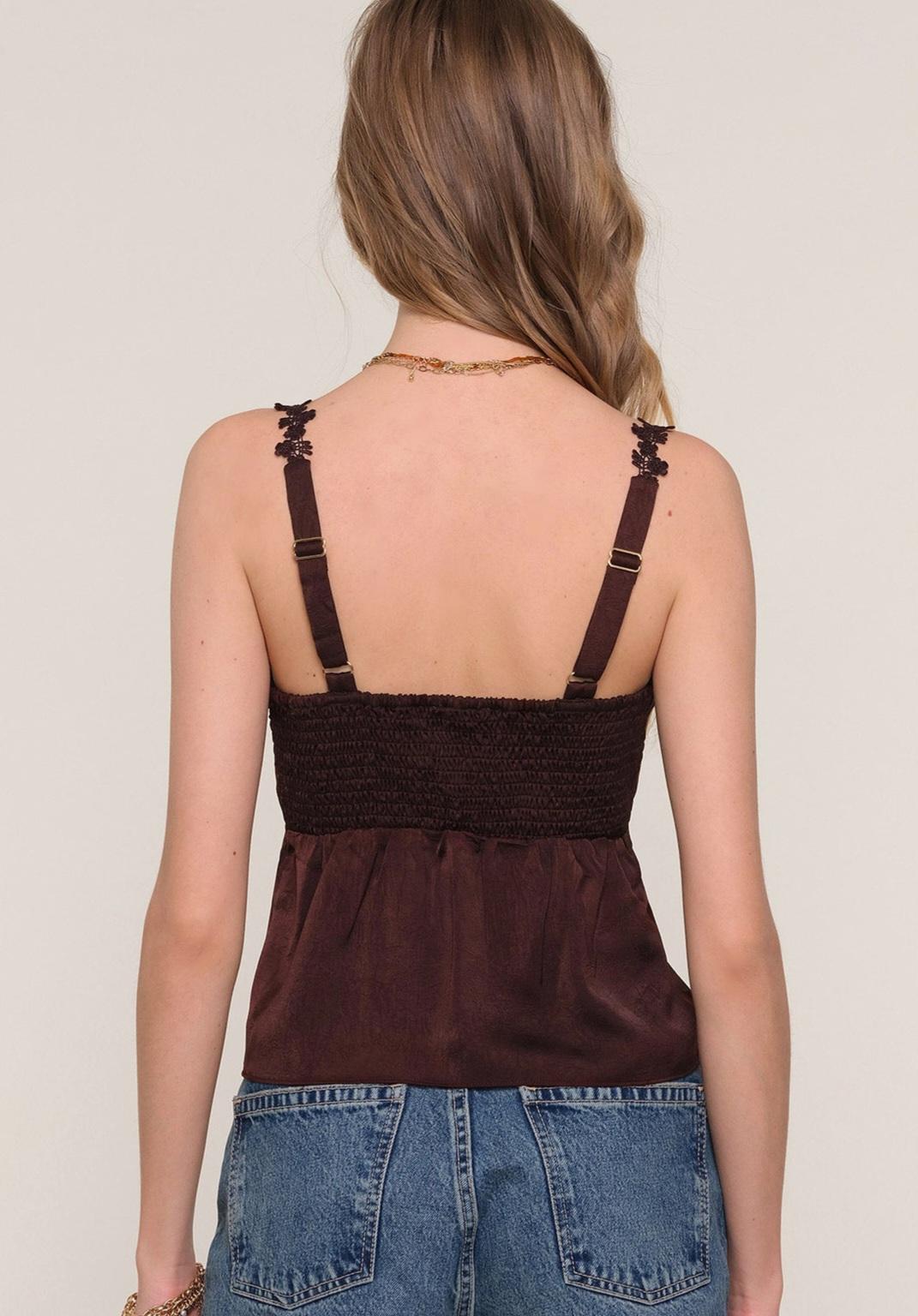 Crafted from soft hammered satin, the Esna Cami combines elegance with comfort. Its delicate lace trim adds a refined touch, while the smocked back panel ensures a flattering, flexible fit. Adjustable straps allow for personalized wear, making this top a sophisticated staple for any wardrobe.