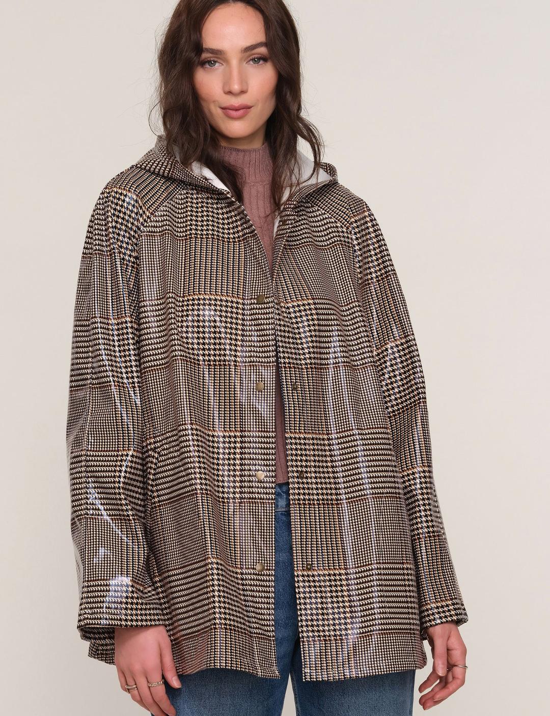 The Jesse Raincoat blends fashion with practicality. Crafted from rainproof fabric in a classic plaid print, this jacket features a hood, pockets, and snap-front closure. Ideal for rainy days, it offers comfort without compromising on style.
